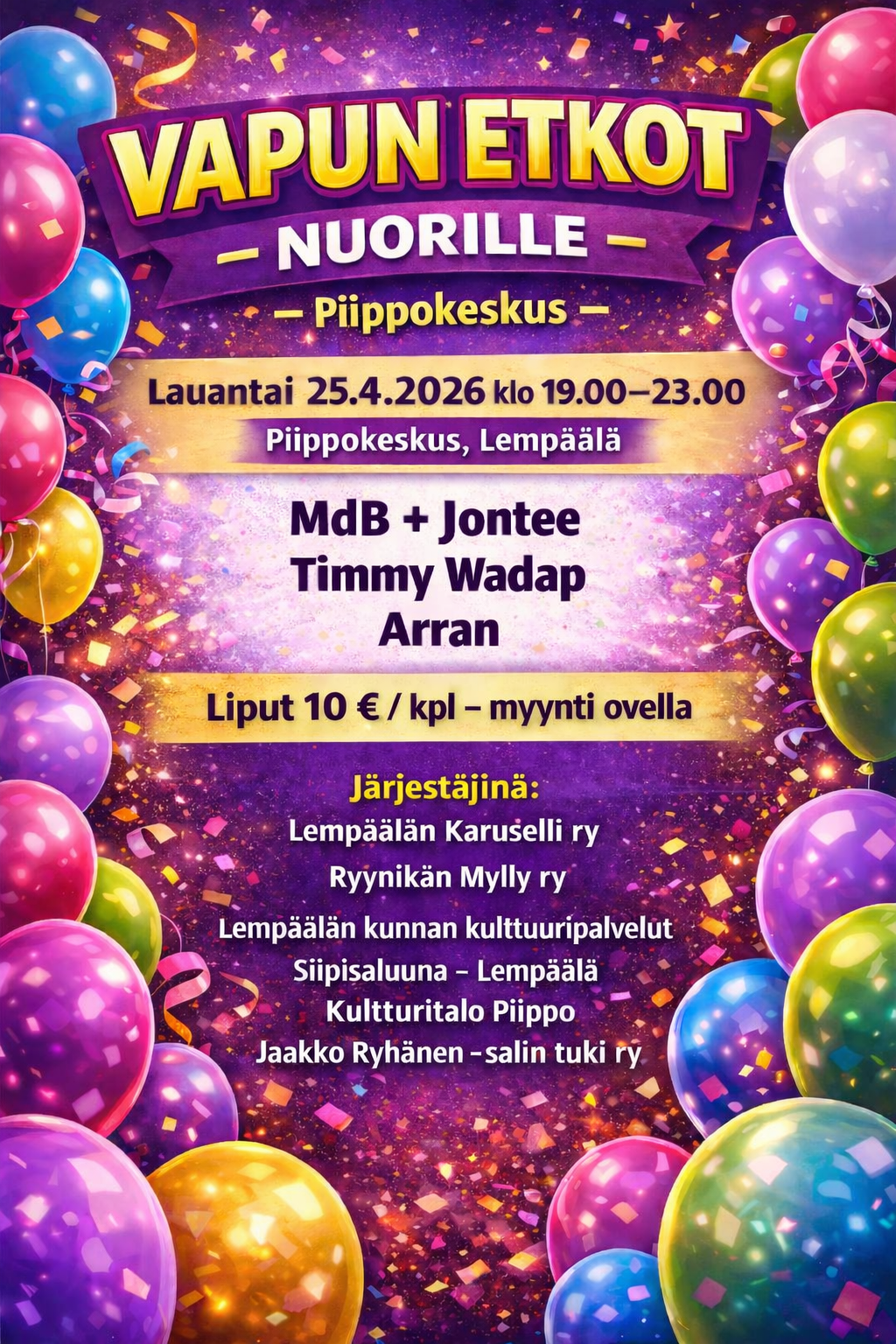 Tule mukaan vuoden kovimpiin nuorten Vappu-etkoihin 25.4.2026. Luvassa on energinen ilta täynnä livemusiikkia, huikeaa tunnelmaa ja paikallisia nousevia artisteja.